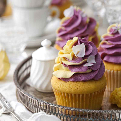 2. Buttercream — Place softened butter in a large bowl, and sift in powdered sugar. Using a hand-held mixer; mix until well incorporated. Next, add in vanilla & milk to adjust the consistency. Mix on medium speed until everything is well combined. *If the cream is too dry add 1/2 tbsp at a time to adjust the consistency. Place half of the buttercream in a bowl. Set aside. Add Suncore Foods® Purple Sweet Potato Powder to the other half of the buttercream. Mix until well incorporated. Once ready; transfer the buttercream into a piping bag filled with star tips (purple on the left side; yellow on the right side).