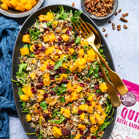 Season's Eatings! Our stomachs are rumbling in anticipation of the feast of all feasts! If you're excited for tonight's dinner as we are, you may have already have a side dish to bring to the table. If not, fret not! This Butternut Squash Quinoa Salad is a cinch and can be tossed and ready to go in a pinch! Peppery arugula, sweet-tart cranberries, creamy butternut squash, and Suncore Foods® Rainbow Quinoa Seeds come together to make a superstar salad that may or may not steal the shine from the sweet potato casserole or mashed taters. This bowl of delicious goodness is so versatile, that it pairs with just about any main dish and is even great on its own! Today is a day to be thankful for what makes our lives beautiful, so let's celebrate full hearts and full stomachs!