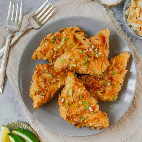 If you love tofu and coconut then we have the perfect food for you! Made to a crispy perfection, these Crispy Toasted Coconut Crusted Tofu with some sweet chili sauce that is sure to satisfy anyone's stomach! Using Suncore Foods® Hemp Seeds helped achieve the delicious exterior colorful yumminess. These are a great addition to rice, noodles, or salads, or can be eaten just by itself!