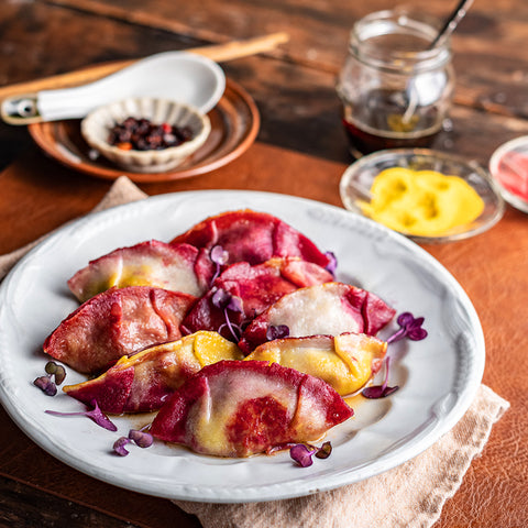Treat yourself to dumplings delicious! These delightful and gorgeous Abstract Rainbow Dumplings will make a perfect lunch. We eat with our eyes first, we used Suncore Foods® Red Beet, Ruby Red Radish & Yellow Goldenberry Powders to turn your ordinary dumplings into a colorful feast for the eyes. Add a pop of color to your day and fill your tummy with goodness with this simple recipe. Have fun and get folding.