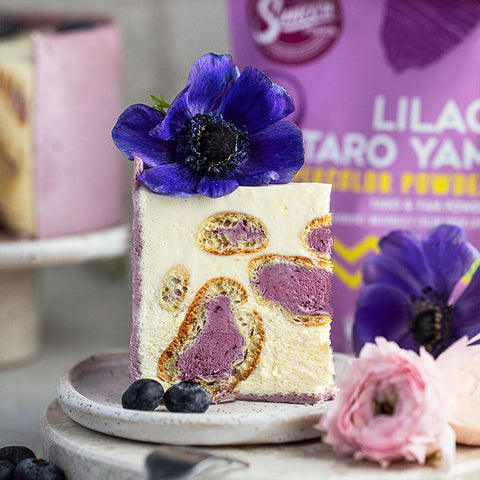 Have you ever had a cake wrapped in a cake? Well you're in for a delicious treat! With an incredibly light and delicate sponge cake collar in an elegant shade of purple made from Suncore Foods® Lilac Taro Yam Powder, this Lilac Taro Yam Cake will you leaving floating in happiness after you taste it. Like a perfectly wrapped gift, once you cut through the outer sponge, into the creamy mousse, you will find another hidden treat inside--frozen blueberry cream filled choux! It's the cake that keeps on giving!