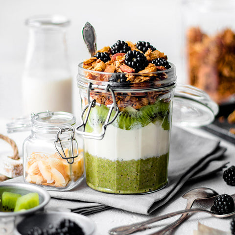 This quick & easy, creamy Matcha Coconut Chia Pudding Jar is full of delicious goodness to keep you satisfied all morning! It's perfect with homemade granola and fresh fruit. Made with Suncore Foods® Midori Jade Matcha Powder to create the beautiful green color, that can help you stay energized throughout the day. To top it all off, sprinkled with homemade granola made from Suncore Foods® White Chia Seeds. Get your spoons ready to dip into this dream of breakfast!