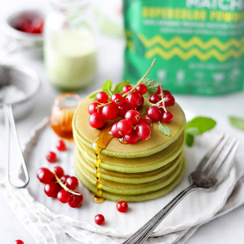 There's just something about stacks of fluffy, buttery breakfast cakes that makes us feel like we're starting the morning with dessert and this perfectly scented Midori Jade Matcha Pancake is calling. Are you ready for the dreamiest pancake? Made incorporating Suncore Foods® Midori Jade Matcha Powder to give it a brilliant green hue that stands out and a flavor boost that you can't stop eating. It's super airy and fluffy like you're eating cotton clouds. Served with warm maple syrup and a red currants.