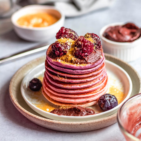 2. Sift in the flour and baking powder, then heat and grease a griddle. Spoon some batter onto the pan, then divide the remaining batter into 2 bowls. In one bowl add Suncore Foods® Ebony Carrot Powder and repeat the same to the 2nd bowl by adding Suncore Foods® Pink Pitaya Powder.