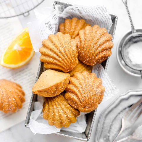 3. Brush Madeleine pan with melted vegan margarine. Scoop batter into moulds using a mini ice cream scoop. Bake at 180º preheated oven for 20-25 minutes until edges begin to become a little golden. Enjoy!