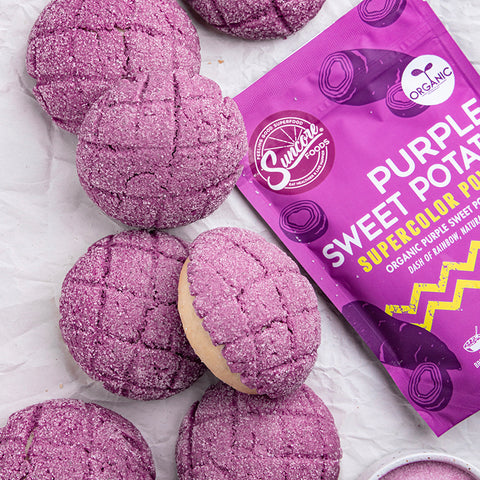 Fluffy, airy, and moist is what our new favorite go-to breakfast is all about! Who doesn’t love a breadbasket at the table? The recipe below makes 8 bountiful buns, great for brunch at home or just because. A perfect pair to complement your morning coffee or tea, it’s a sure way to brighten up your day. Not only is the Purple Sweet Potato Melon Pan bursting with decadent sweet potato and beautiful purple hues made possible with Suncore Foods® Purple Sweet Potato Powder, its dairy-free, egg-free, and vegan friendly! Lightly sprinkled with sugar, it’s a hot cross bun of your childhood dreams.