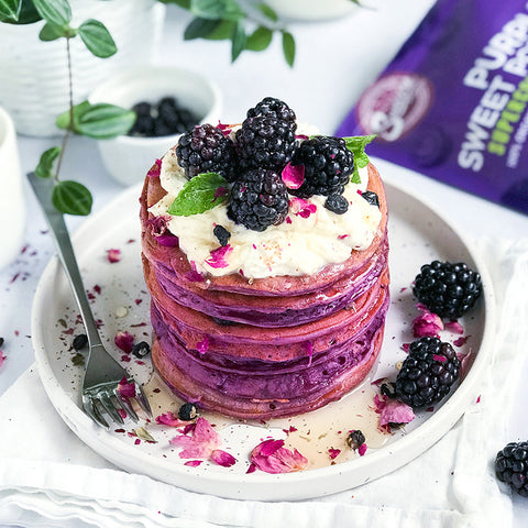 Making breakfast fun with these light & fluffy Purple Sweet Potato Pancakes. If you're looking for a delicious & beautiful breakfast to start the morning bright, these pancakes are a must-try! They're plant-based dyed with Suncore Foods® Purple Sweet Potato & Ebony Carrot Powders. They are not only pretty to look at, they're really delicious too! Treat yourself to a fancy royal brunch!