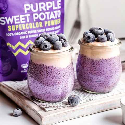 1. In a jar, mash the cooked yam, then mix in the nut/seed butter and milk. Whisk in Suncore Foods® Black Chia Seeds and sweeten to taste, then add enough Suncore Foods® Purple Sweet Potato Powder to your desired color.