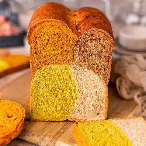 Happiness is biting into bread! Make breakfast fun and whimsical with this beautiful Quadrant Rainbow Loaf! Top it off with your favorite spread and fuel your day with happiness. This lovely, welcoming, warm colors hue is made with Suncore Foods® Pink Pitaya, Red Beet, and Yellow Goldenberry Powders. This loaf is easy on the eyes and yummy in your tummy! Bread is love-made edible. Enjoy and start your day with a good breakfast.