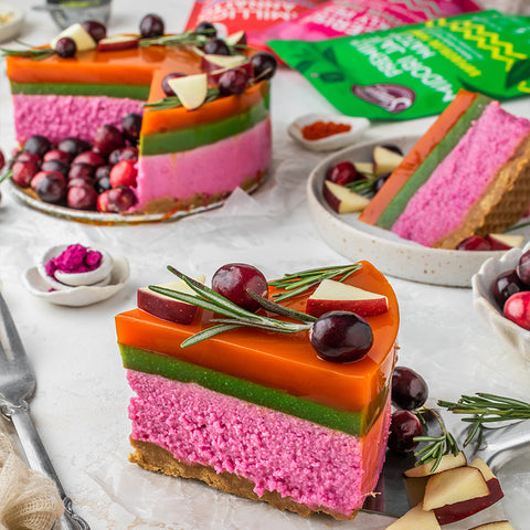 You are the apple of my pie! This stunning apple pie cheesecake will make you crave for more after your first slice. With a beautiful marriage between cheesecake and apple cider jelly, this dessert is definitely one of a kind đ¤! This beautiful color combination is made with Suncore FoodsÂŽ PowdersâCerise Prickly Pear, Midori Jade Matcha, Red Beet, and Yellow Goldenberry Powders. This beauty will be the spotlight at any occasion. Let's celebrate today because why not! Bake the world the better place. May the pies be ever in your flavor!