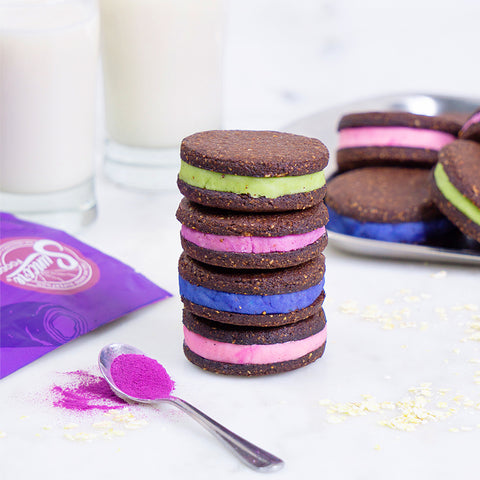 Sign us up for a stack of these Rainbow Sandwich Cookies made with radiant bright colors and we can totally snack on these all day long! These go great with a glass of milk or a quick snack when you're on the go! Mix and Match our Suncore Foods® Powders for a frenzy of rainbow cookies. Each color is unique and fun, so these cookies will never get boring! Happy snacking!