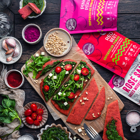 Are you looking for a tasty, plant-based lunch? Well, look no further! We are serving something just perfect for you, delicious red beet pitaya flatbread with kale pesto! What are you waiting for? Let's grab a bite, and you will be surprised by how soft and puffy this bread is, top it with the most delightful kale pesto. It's just *chef kiss* delicious. Make your meal fun and more enjoyable with Suncore Foods® Red Beet and Pink Pitaya Powders to create this vibrant red hue. Try this delicious recipe.