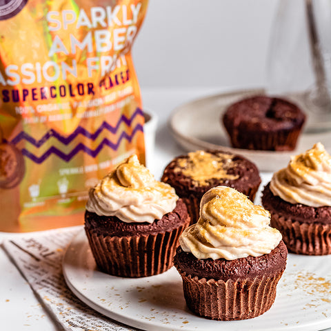 These Sparkly Amber Passion Fruit Chocolate Cupcakes are shimmering their way down to satisfy all your sweet tooth cravings! Light, sweet, filled with tropical flavors, and topped with Suncore Foods® Sparkly Amber Passion Fruit Flakes to let them shine! Made perfectly to celebrate Wellness Wednesday or any day of the week with a little sparkle and these little cakes in hand. These beauties completely blown our minds away!