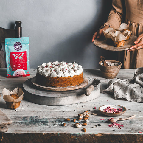 10. For the buttercream, beat the butter for 2 mins. Then add the other ingredients listed under buttercream and beat for 1 to 2 mins until fluffy. Frost as desired and sprinkle with Suncore Foods® Rose Petals